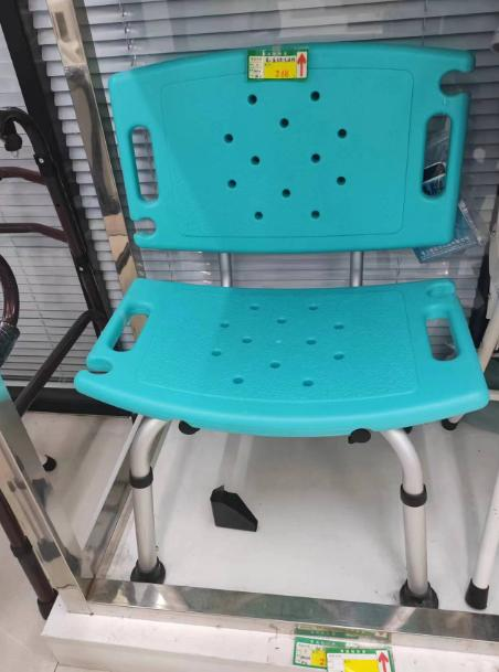 在多家線下門店,洗澡椅已成為常見的養老輔具。記者在現場看到,洗澡椅的座椅和靠背均設計了排水孔,具有良好的排水性和防水防銹性,且防滑性較好,穩固不易側翻。但記者也發現,一款富士康牌洗澡椅并未設置可供老人抓握的扶手,老人如想從洗澡椅上起身,則可能需要借助外力(見下圖)。
